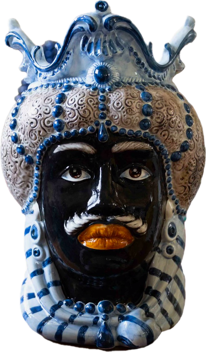 Moro’s heads are decorative ceramic sculptures originating from Sicily. The sculptures typically showcase expressive faces adorned with elaborate turbans, headdresses, and jewelry, capturing the exotic allure of the Moros.